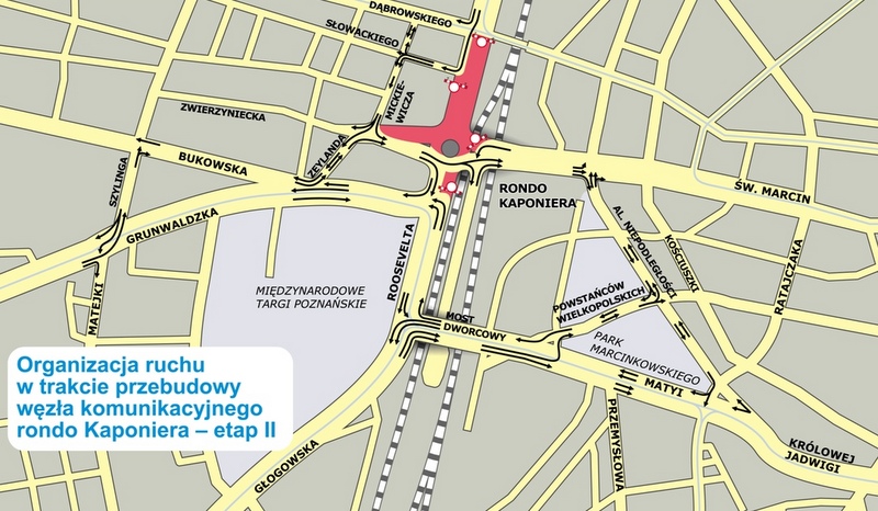 Z związku z gruntowną przebudową Kaponiery od soboty trasę zmieni 8 linii tramwajowych, a cztery w ogóle nie będą jeździć. Objazdy wytyczono przede wszystkim przez ulicę Dąbrowskiego. Modernizacja najważniejszego węzła komunikacyjnego potrwa co najmniej do końca 2013 roku.