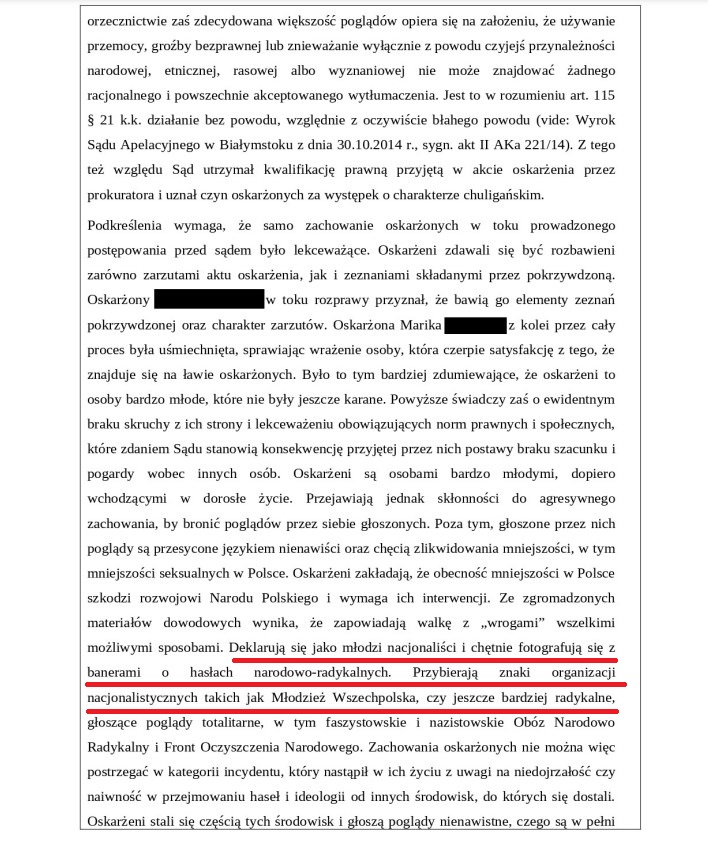 Tymczasem na 12 stronie uzasadnienia wyroku w sprawie Mariki M. czytamy o oskarżonych, że: „Przybierają znaki organizacji nacjonalistycznych, takich jak Młodzież Wszechpolska, czy jeszcze bardziej radykalne…”.