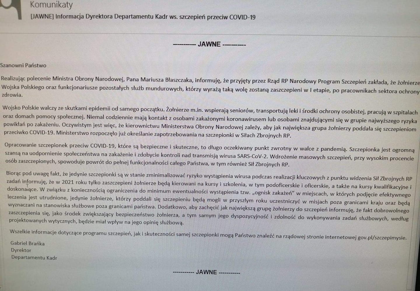 Twierdzą, że żołnierzom, lekarzom i nauczycielom bywa stawiane ultimatum - "albo się szczepisz, albo nie awansujesz". Sprawa ma związek z pismem z Ministerstwa Obrony Narodowej o zakazie szkoleń i awansów dla niezaszczepionych żołnierzy. Poddanie się szczepieniom ma mieć także wpływ na ocenę służby żołnierza.