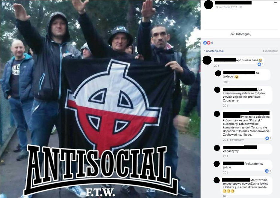 Jednemu z mężczyzn zarzucono też publiczne propagowanie ustroju faszystowskiego poprzez umieszczenie zdjęcia przedstawiającego siebie z wyciągniętą ręką na portalu społecznościowym. Mężczyźni zeznali, że zdjęcia zostały zrobione po meczu piłki nożnej.