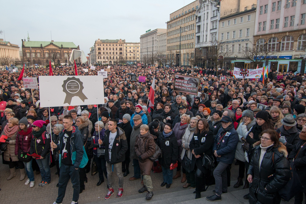 Wśród popierających protest był prezydent Poznania Jacek Jaśkowiak. "Żona mnie poprosiła, żebym dzisiaj przyszedł tu razem z nią. Uważam, że postulaty kobiet są bardzo na czasie. Nie chodzi o to, żeby szarmancko całować kobiety w rękę i pokazywać im przez to szacunek, ale poprzez działania. Te działania powinny respektować równouprawnienie kobiet - m.in. żeby kobiety zarabiały tak, jak mężczyźni".