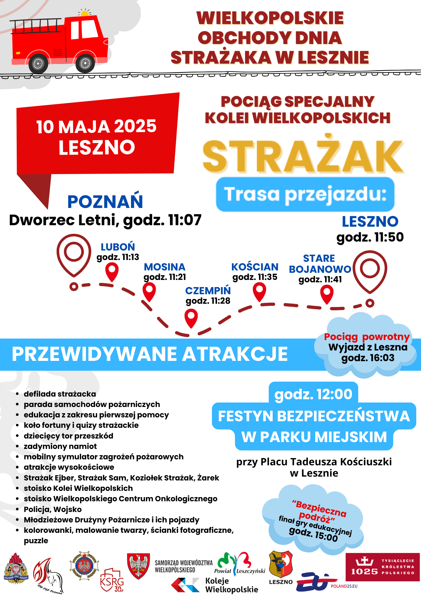 W obchodach wezmą udział zarówno strażacy zawodowi, jak i ochotnicy. Dla uczestników z Poznania pojedzie do Leszna specjalny pociąg „Strażak”, który odjedzie z Dworca Letniego o godzinie 11:07 i dotrze do Leszna o 11:50. Powrót zaplanowano na godzinę 16:03.