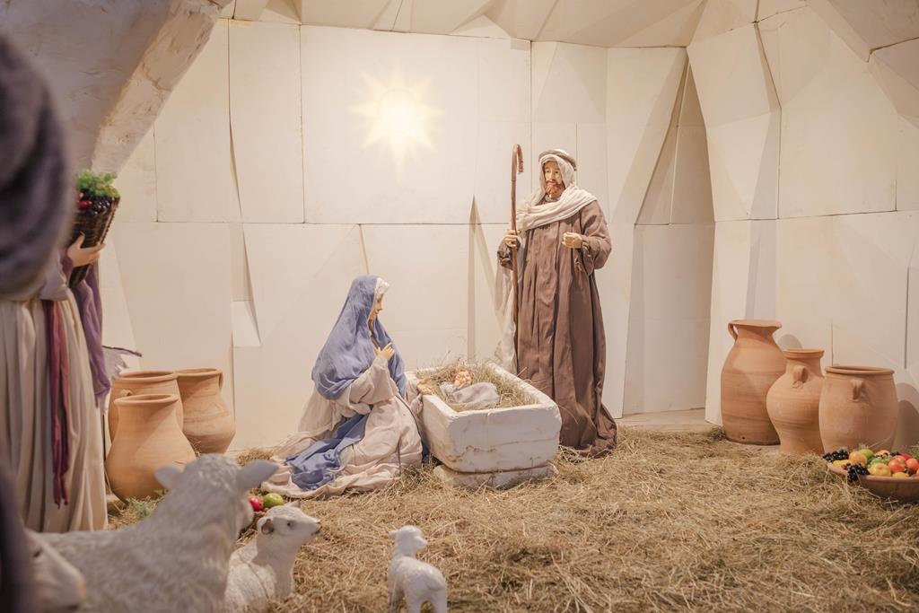 Główna szopka w bazylice przedstawia betlejemską grotę na tle domu. W centralnym punkcie widzimy nowo narodzonego Jezusa Chrystusa w Betlejem. Czuwają przy nim Maryja i Józef. Obecni są także pasterze i trzej mędrcy ze wschodu, a także zwierzęta. Ponadto ukazane są sceny z życia ówczesnych Żydów - mieszkańców Palestyny.