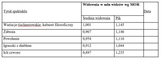 Mamy ofertę, stworzoną w zaplanowany i przemyślany sposób. Zbudowaliśmy najchętniej odwiedzany teatr w Polsce - Teatr Telewizji. Od 2016 wyemitowaliśmy ponad 900 godzin spektakli teatralnych, które obejrzała ponad 28 milionowa widownia. To najlepszy dowód na to, że spektakle teatralne na dobre zagościły na antenach telewizji publicznej.