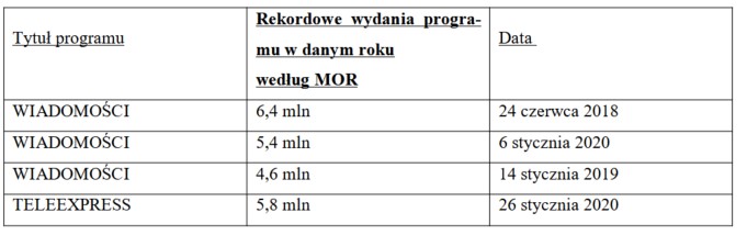 Nasze serwisy informacyjne („Wiadomości” i „Teleexpress”) są liderami oglądalności, formaty TVP skierowane dla seniorów zdobywają milionową oglądalność i międzynarodowe nagrody, nasze wydarzenia gromadzą rekordową liczbę widzów. Dostrzegliśmy potencjał tam, gdzie inni widzieli słabości. W programach publicystycznych i serwisach informacyjnych zdecydowaliśmy się na mówienie o Polsce i jej sukcesach – dziś to TVP INFO jest gwarantem pluralizmu medialnego. To tu można usłyszeć głosy, które przez lata były wykluczone z debaty publicznej. Dowodem tego są wyniki oglądalności naszych flagowych serwisów, które nawet według Nielsena wyprzedziły konkurencję.