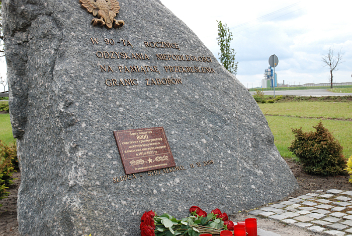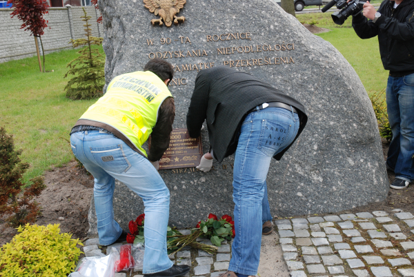 Około godziny 15 w niedzielę nieznani mężczyźni przytwierdzili na głazie upamiętniającym odzyskanie niepodległości przez Polskę, tablicę z rosyjskim napisem: "tutaj spoczywa 8 tysięcy czerwonoarmistów brutalnie zamęczonych w polskich obozach śmierci w latach 1919-1921".