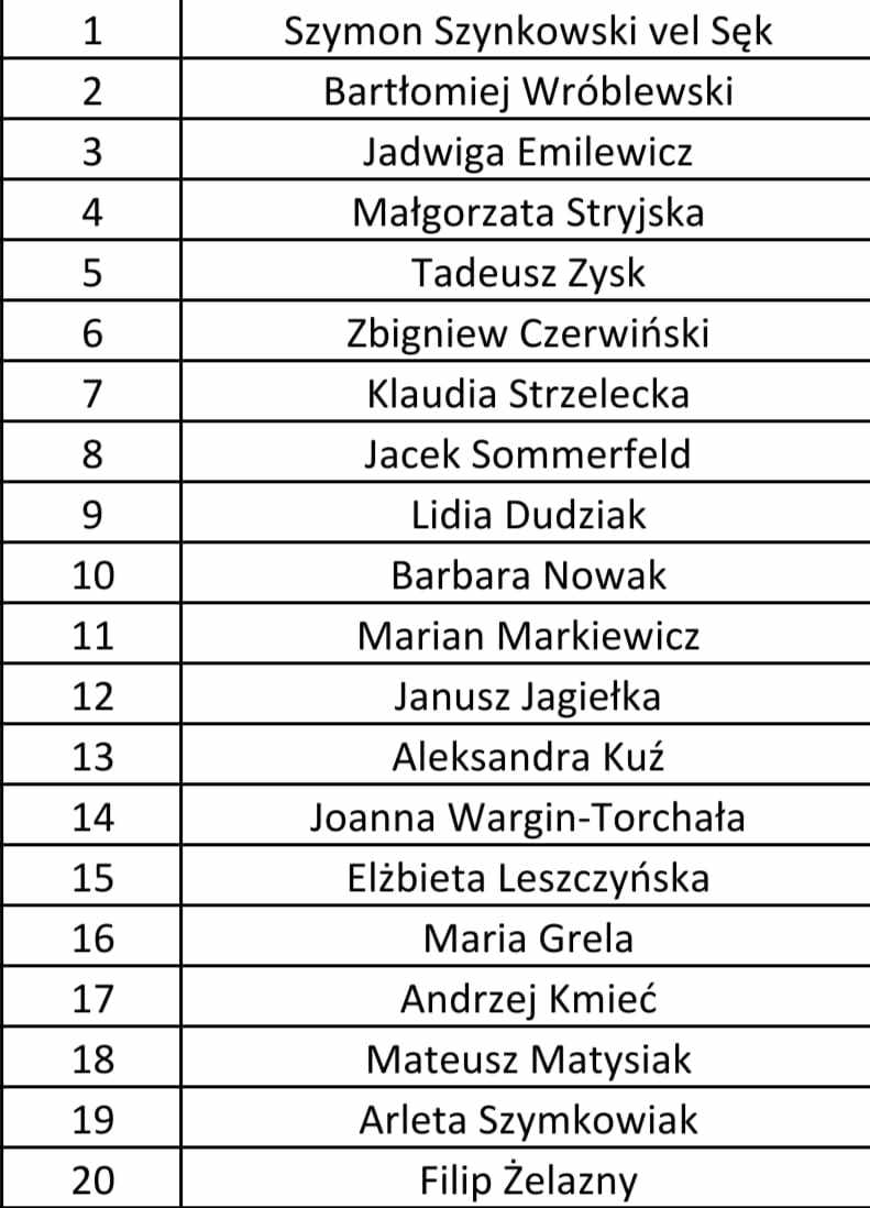 Obsada pierwszych trzech miejsc była znana od tygodnia. Jedynką jest minister do spraw europejskich Szymon Szynkowski vel Sęk, dwójką poseł i szef lokalnych struktur Bartłomiej Wróblewski, a trójką wiceminister polityki regionalnej i funduszy Jadwiga Emilewicz. Była wicepremier formalnie nie należy do Prawa i Sprawiedliwości.