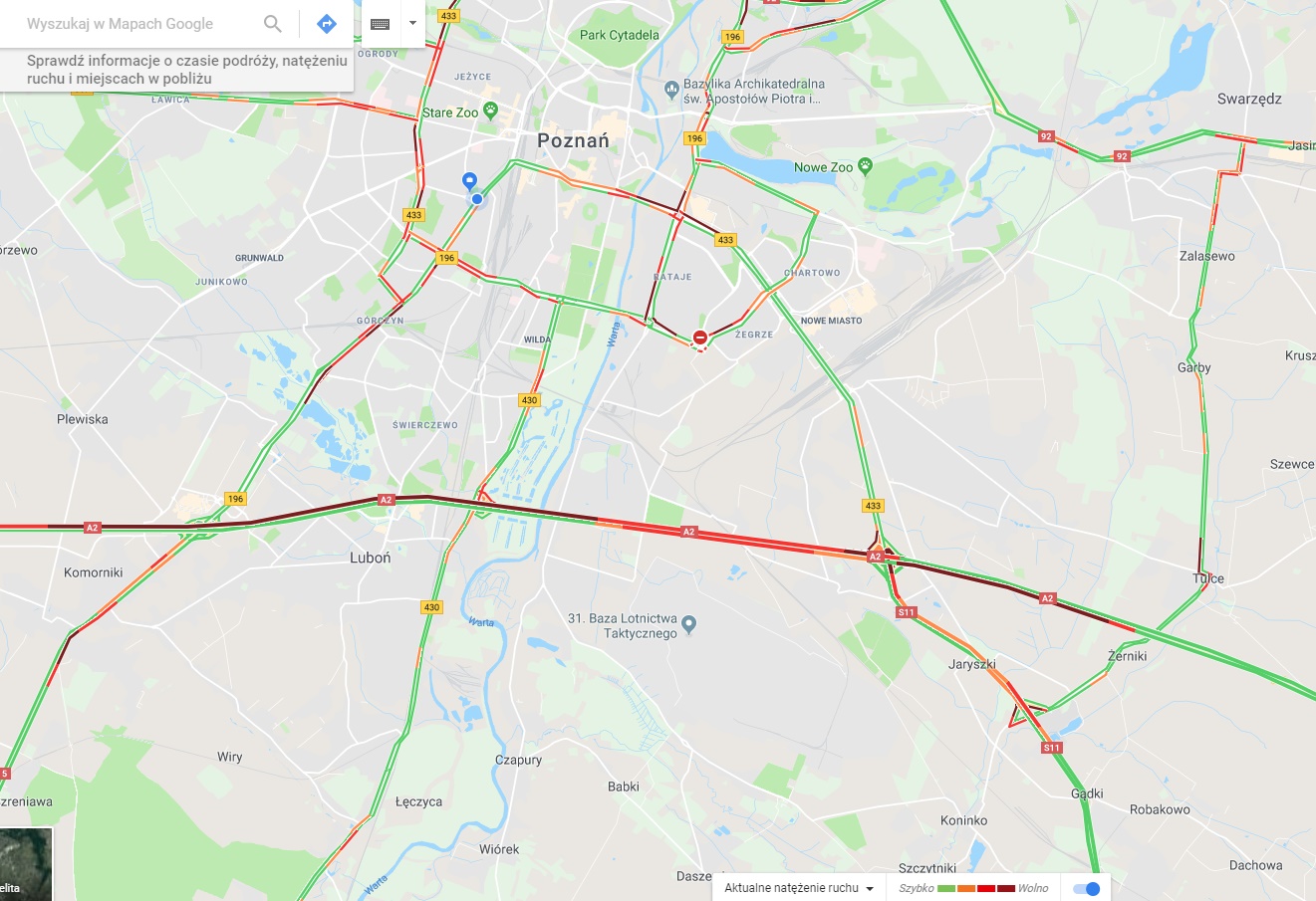 Autostrada A2 jest też zakorkowana w kierunku Świecka - powodem są prace przygotowawcze do budowy 3 pasa między Komornikami, a węzłem Poznań Zachód.