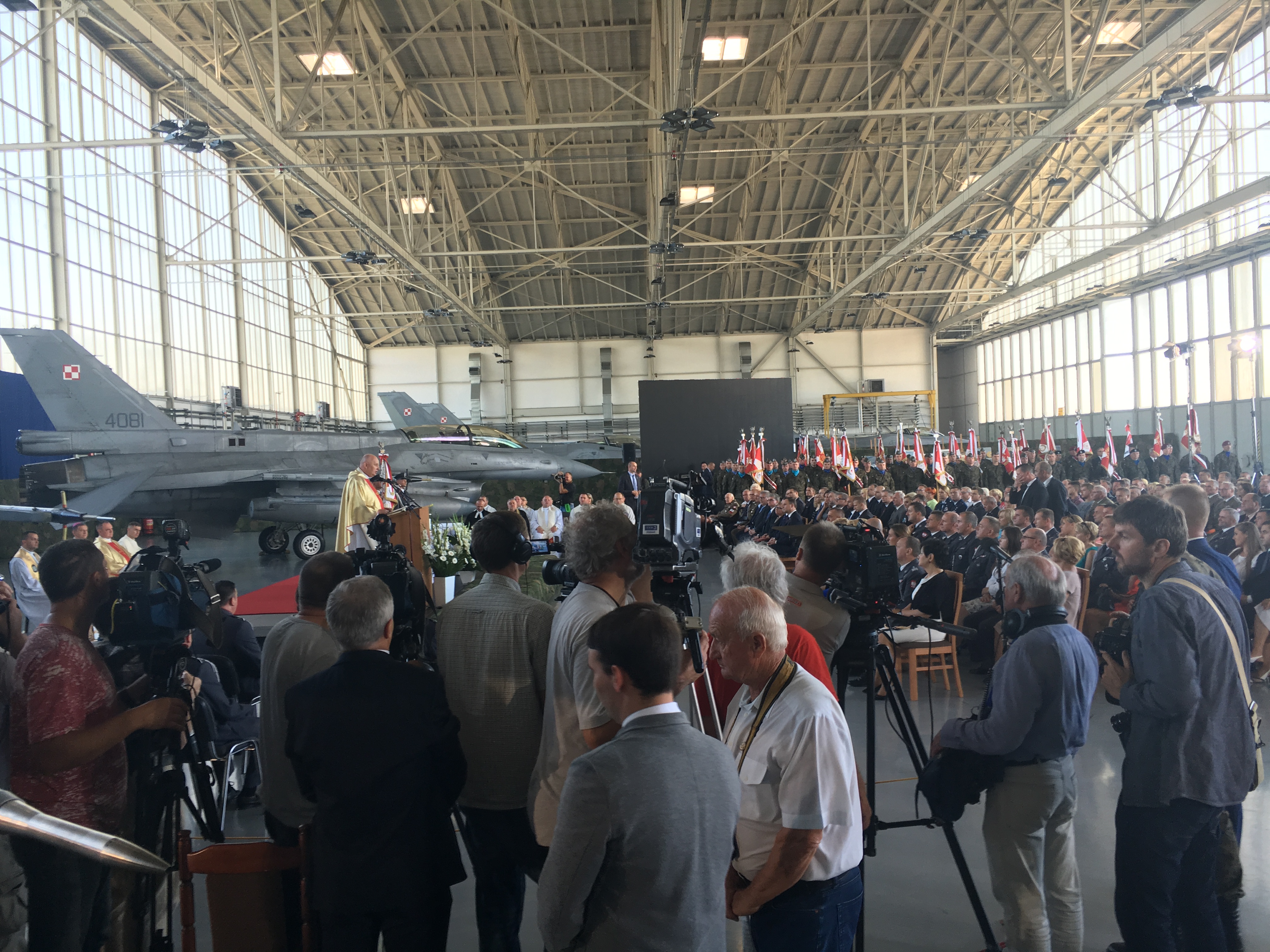 Uroczystości rozpoczęły się od mszy w intencji polskich lotników, odprawionej przez biskupa Józefa Guzdka. Podczas homilii biskup polowy Wojska Polskiego podziękował za profesjonalizm tym, którzy służąc w lotnictwie wojskowym, lub przyczyniając się do jego rozwoju dbają o bezpieczeństwo Polski. Jak mówił, "dziś w sposób szczególny zwracamy uwagę na wysokiej klasy specjalistów, którzy od 10 lat pilotują i obsługują samoloty F-16". "Ponadto wspominamy i otaczamy wielkim szacunkiem tych, którzy przyczynili się do podjęcia decyzji o ich zakupie, organizacji szkoleń i budowy bazy serwisowej" - dodał.