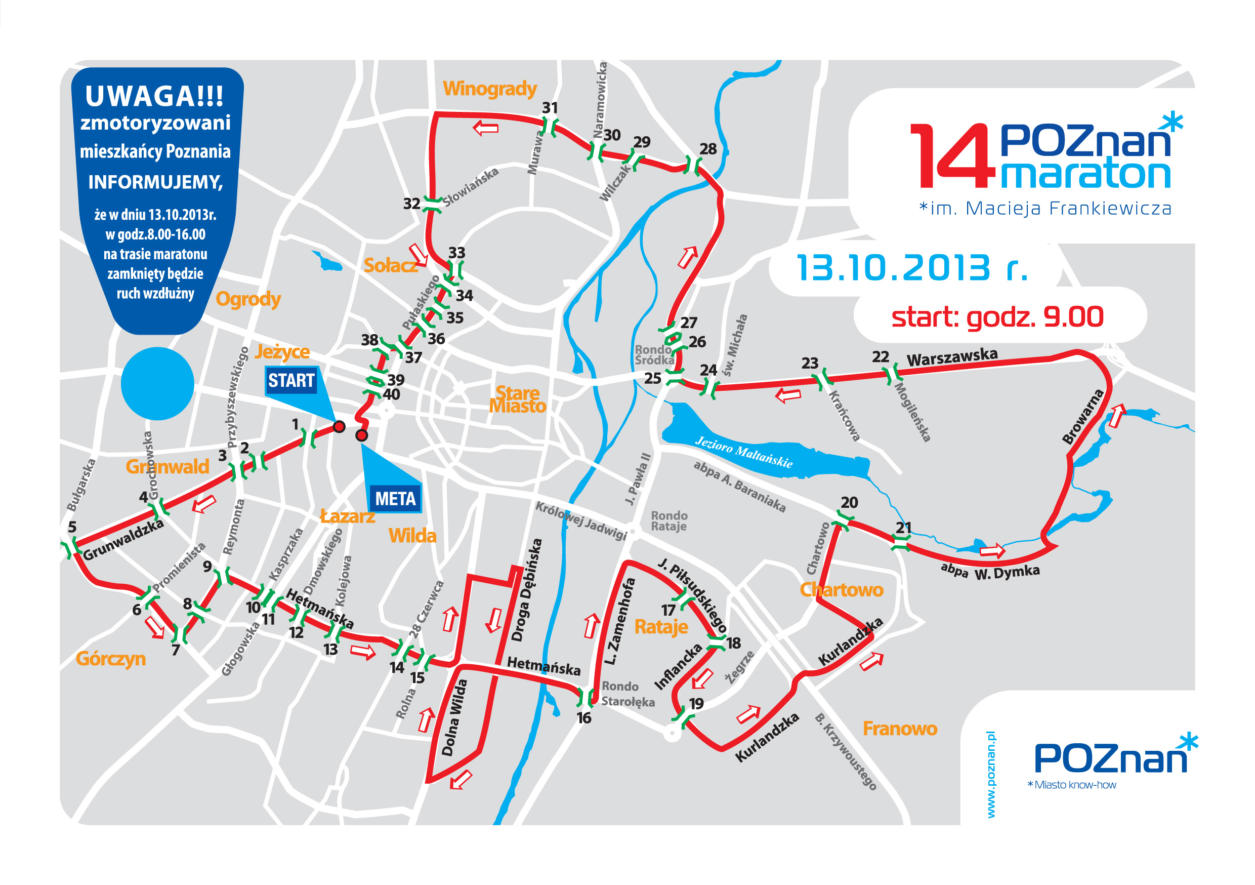 Trasa tegorocznego 14 Maratonu biegnie od Grunwaldu, przez Górczyn, Łazarz, Wildę, Rataje, Chartowo po Winogrady i Sołacz. Zawodnicy przebiegną 33 ulicami, rondami i arteriami komunikacyjnymi. Zmiany w organizacji ruchu będą na 90 skrzyżowaniach. Na 47 - będą śluzy do przejazdów. Start Maratonu - o godzinie 9.00 , z ulicy Grunwaldzkiej przy MTP, meta - Plac Św. Marka, MTP.