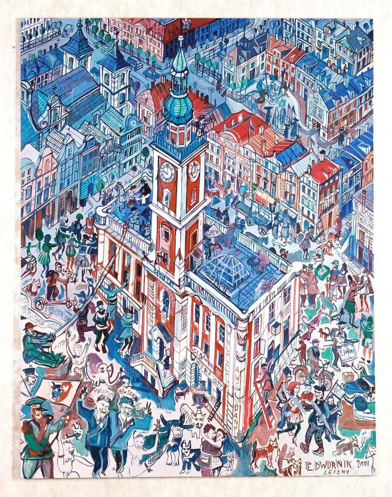 - Edward Dwurnik jeden z obrazów z tego cyklu poświęcił też Lesznu - mówi Jacek Masiakowski z Biura Wystaw Artystycznych. - Jest to ujęcie Leszna z lotu ptaka. Na pierwszym planie obrazu jest ratusz. Stał się dla malarza pretekstem do pokazania życia w mieście - dodaje leszczyński grafik.