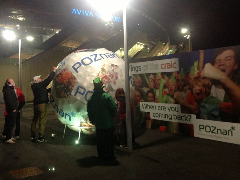 W środę przed stadionem Aviva w Dublinie stanęła olbrzymia piłka z logotypem miasta Poznania i zdjęciami irlandzkich fanów. Każdy mógł na niej napisać swoje pozdrowienia dla Wielkopolan. Piłka wróci do Poznania. Urzędnicy liczą, że przyjadą tu też goście z Zielonej Wyspy. W czasie EURO 2012 Poznań odwiedziło 70 tysięcy kibiców z Irlandii.