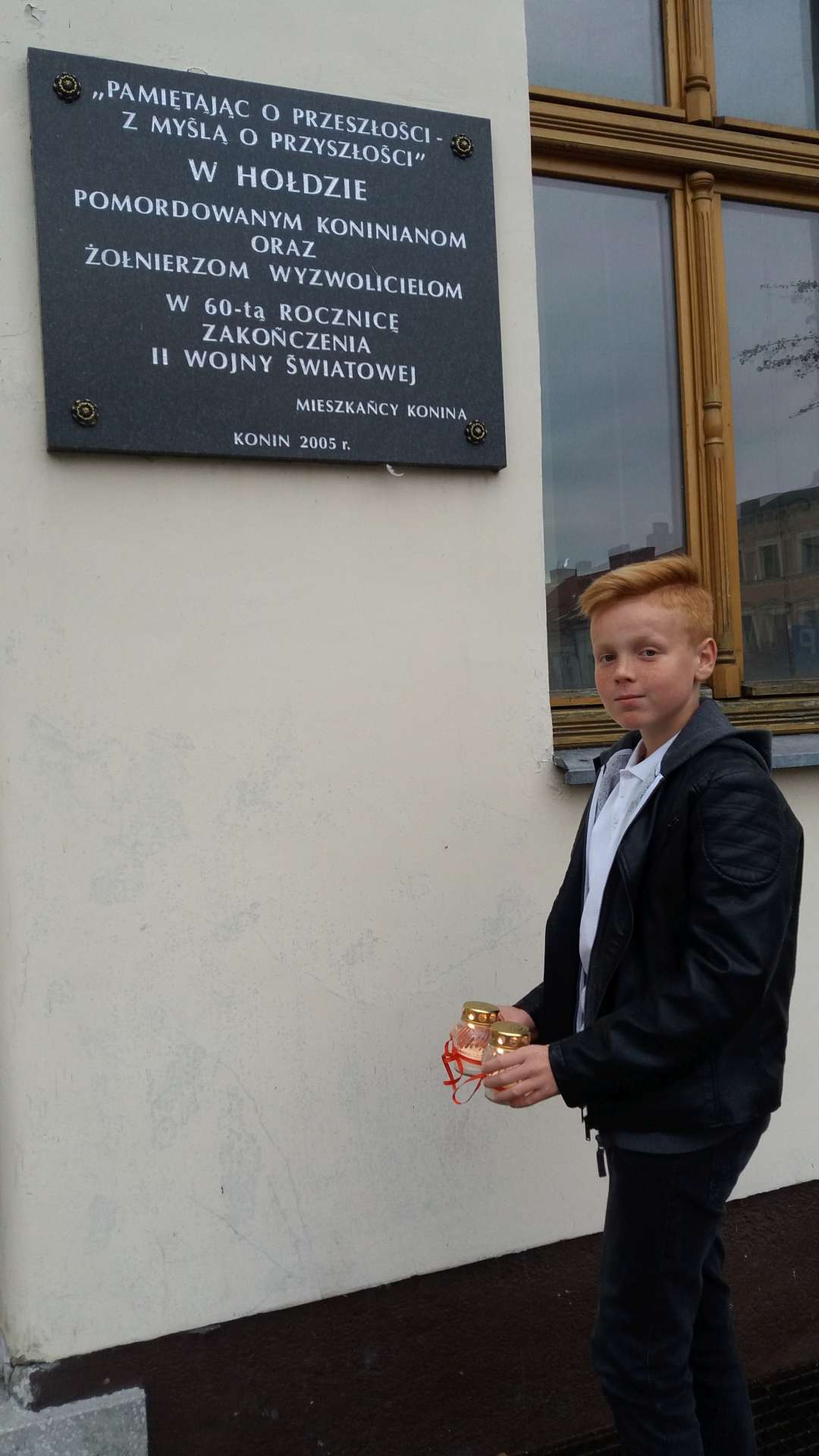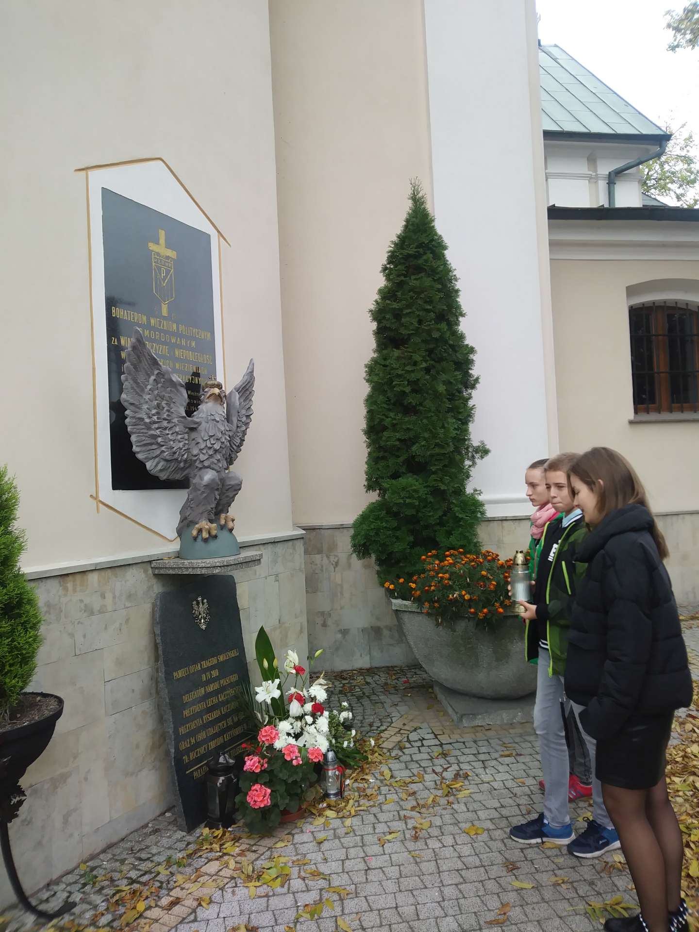 Fot. Pod tablicą upamiętniającą zamęczonego w 1939 roku działacza społecznego Wojciecha Bąka, uczniowie SP 1 i 2