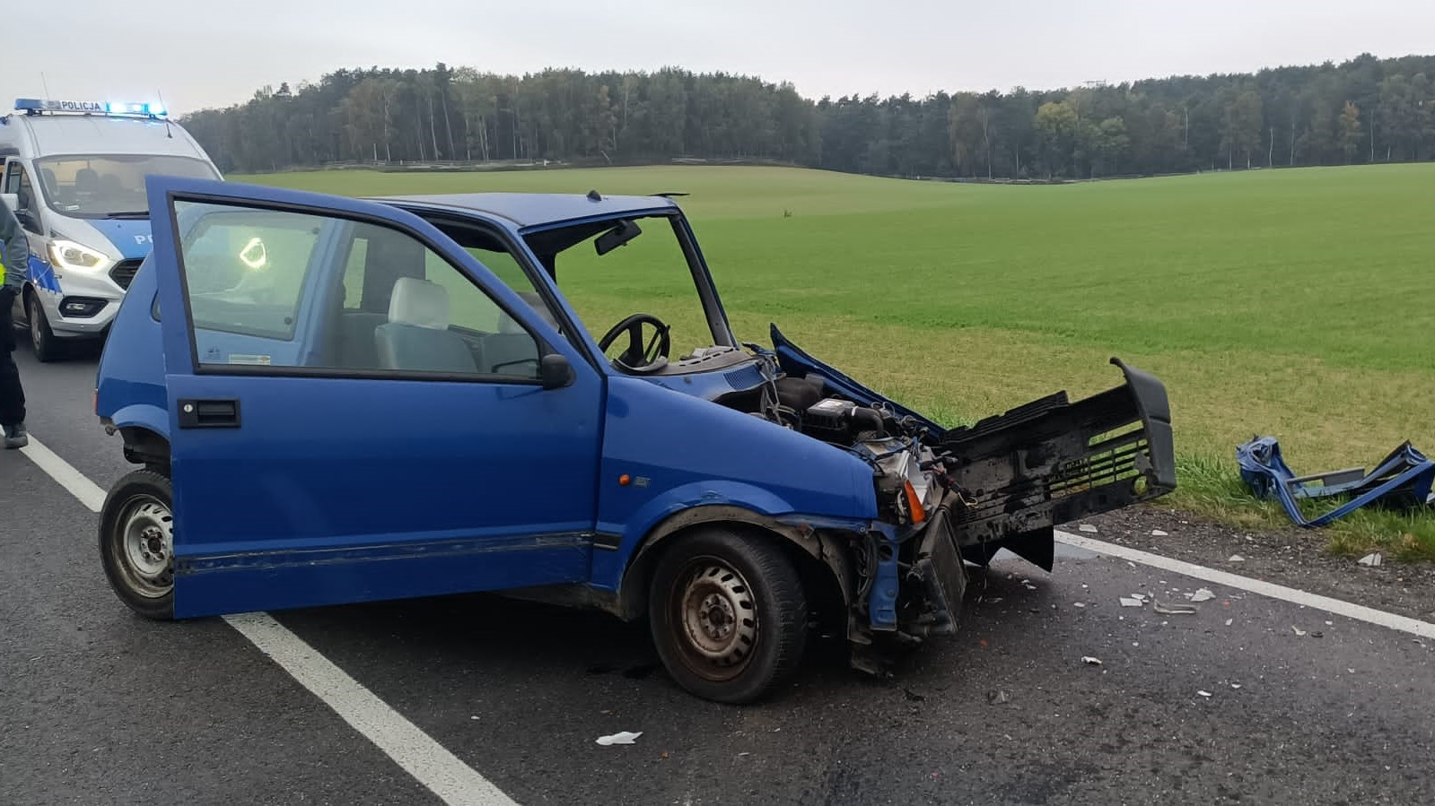 Ze wstępnych ustaleń policjantów wynika, że 79-letni mieszkaniec Leszna, jadący fiatem cinquecento, który jechał od strony Osiecznej w kierunku Leszna, z nieustalonych jeszcze przyczyn, zjechał na przeciwległy pas ruchu i czołowo zderzył się z jadącą z przeciwnego kierunku skodą. Kierował nią 56-letni mieszkaniec powiatu poznańskiego. Niestety pomimo podjętej reanimacji, mieszkaniec Leszna zmarł, nie udało się go uratować. Poniósł śmierć na miejscu. Przez kilka godzin zamknięta była droga z Leszna do Osiecznej