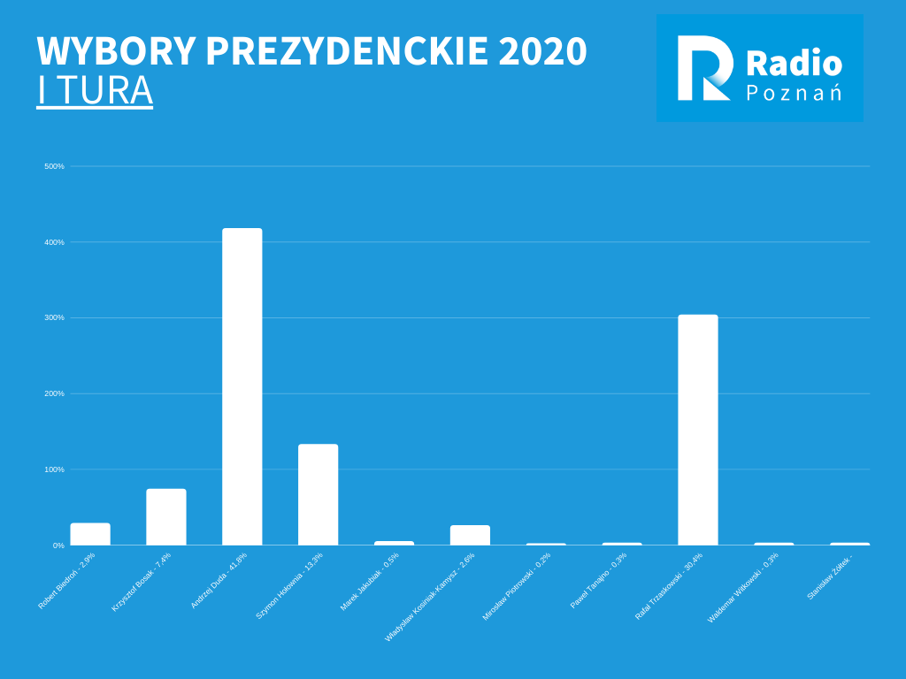 Prezydent Andrzej Duda, według sondażu exit poll, wygrał pierwszą turę wyborów prezydenckich, otrzymując 41,8 procent głosów. Drugie miejsce zajął Rafał Trzaskowski z poparciem 30,4 procent. Gdyby wyniki sondaży się potwierdziły, to za dwa tygodnie 12 lipca, odbędzie się druga tura.