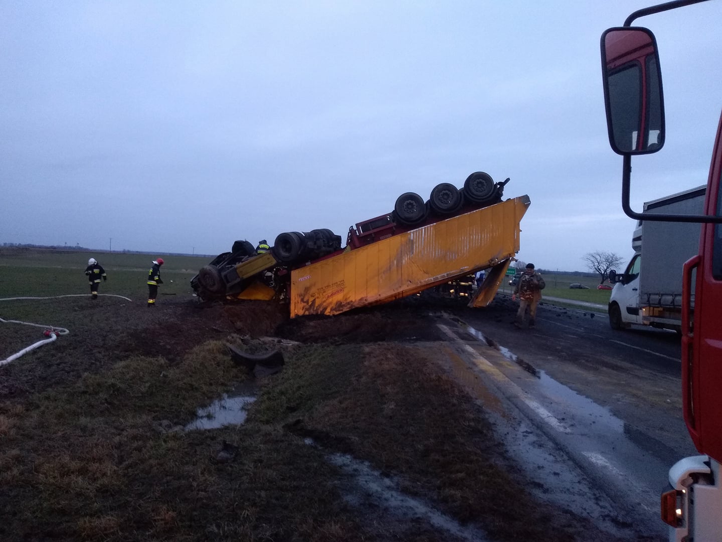 Do zdarzenia doszło około godziny 16.00. W ciężarówce prawdopodobnie pękła opona. Ładunek tak przeważył pojazd, że ten obrócił się kołami do góry. Kierowca został przygnieciony i uwięziony w kabinie. Uszkodzone zostały też 2 inne auta. Na pomoc lokalnym strażakom została wezwana specjalistyczna jednostka z Poznania.