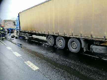 Jadący nissanem micrą 68-letni mieszkaniec powiatu turkowskiego, z niewyjaśnionych przyczyn zjechał na przeciwległy pas ruchu i zderzył się z dwiema ciężarówkami. Kierowca samochodu osobowego z obrażeniami głowy został przewieziony do szpitala. Kierowcom ciężarówek nic się nie stało.