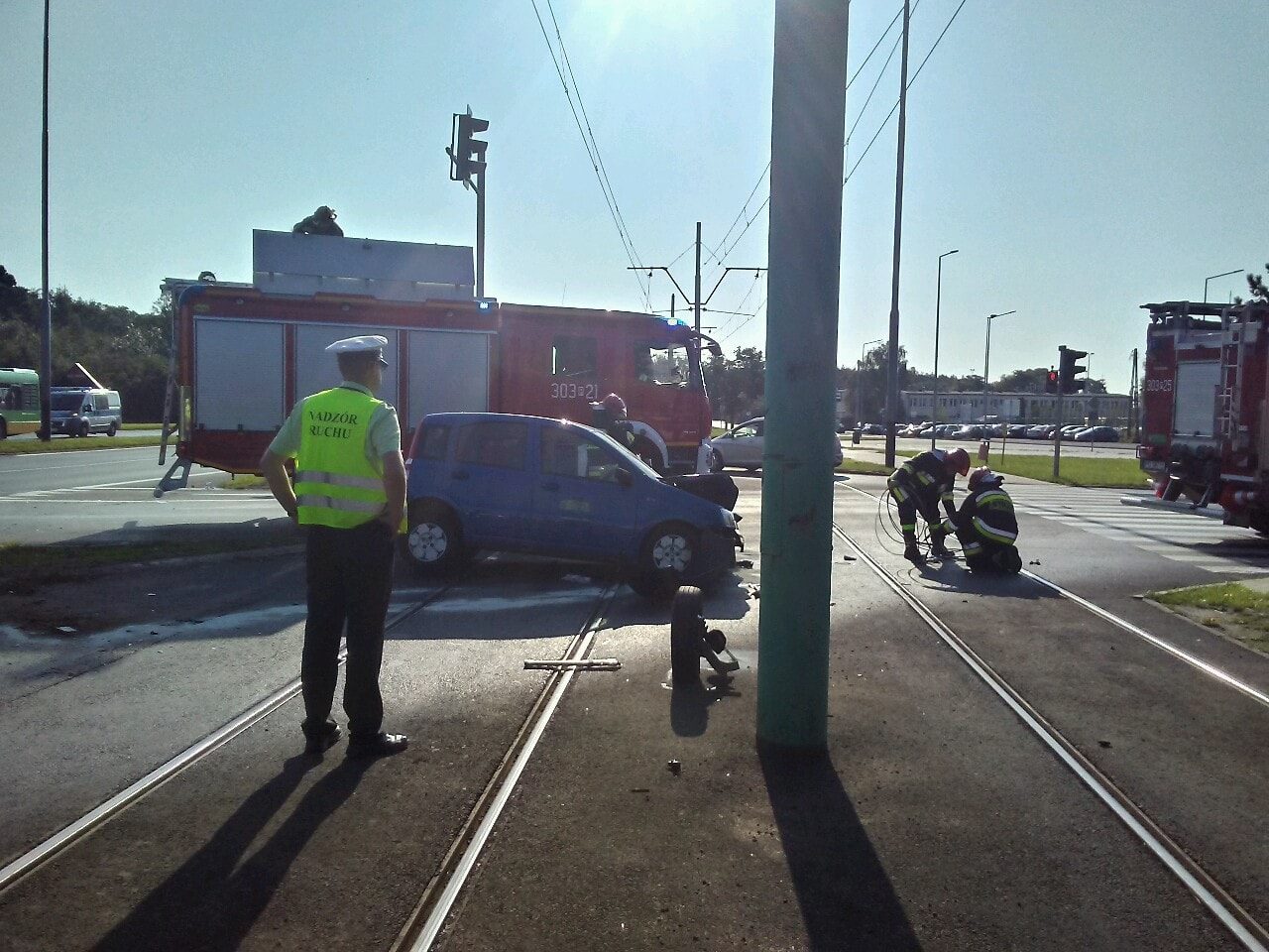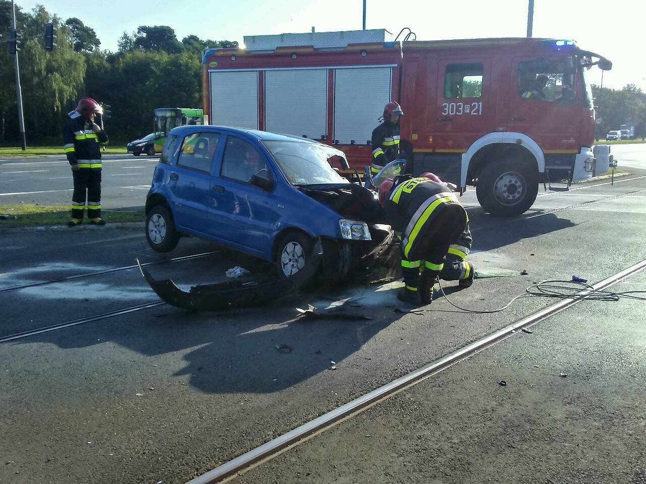 W wypadku brało udział tylko jedno auto, ruch tramwajowy do pętli na Miłostowie wstrzymano ze względu na akcję ratowniczą. Kierowca według wstępnych informacji był nieprzytomny. Po wyciągnięciu z samochodu był badany przez pogotowie ratunkowe. Został odwieziony do szpitala.