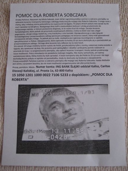 Problem w tym, że standardowe zagraniczne ubezpieczenie pokryło tylko koszty operacji pana Roberta. Za powrót do Polski specjalnym medycznym samolotem rodzina musi zapłacić sama. A to znacznie przekracza jej możliwości. Koszty transportu wynoszą 30 tys. Euro. Razem z chorym mężem w Egipcie została pani Kamila, to pracownica Powiatowego Urzędu Pracy w Kaliszu. Dlatego znajomi z pracy także zaangażowali się w zbiórkę pieniędzy. Informacje o akcji można znaleźć na stronie www.pomocdlarobertasobczaka.pl