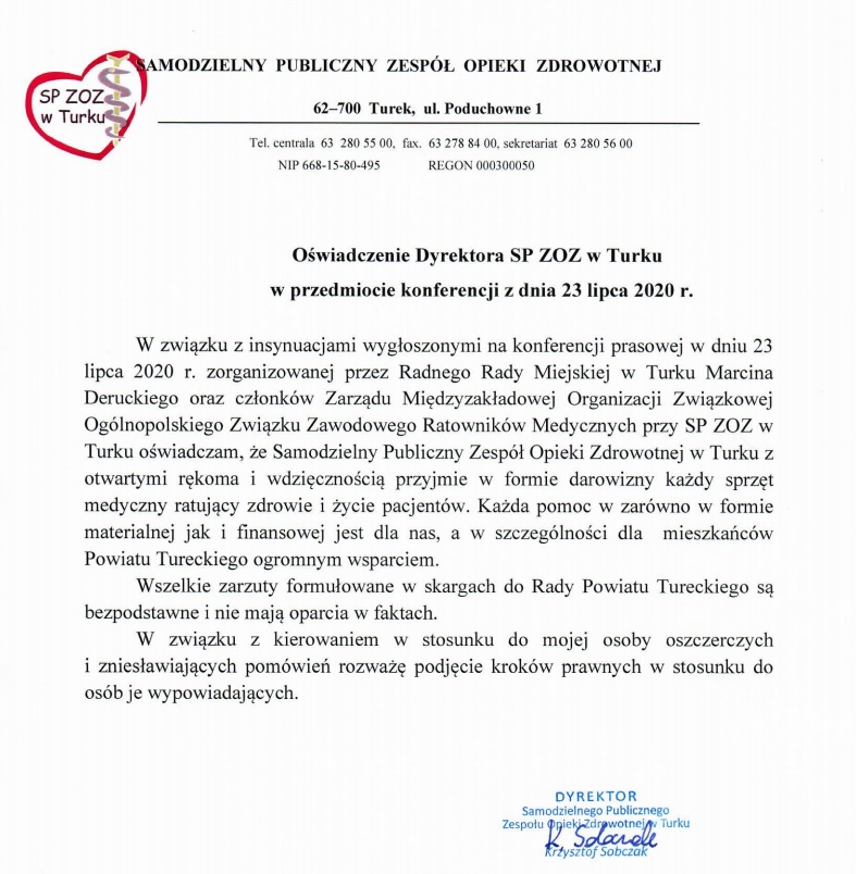 W odpowiedzi na zaistniałą sytuację dyrektor szpitala Krzysztof Sobczak wydał dziś oświadczenie, w którym czytamy, że szpital z otwartymi rękami przyjmie każdą darowiznę sprzętu medycznego. I każda pomoc materialna, jak i finansowa jest mile widziana. Zarzuty na temat nieprzyjmowania sprzętu określa jako pomówienie i zapowiada możliwość podjęcia kroków prawnych.