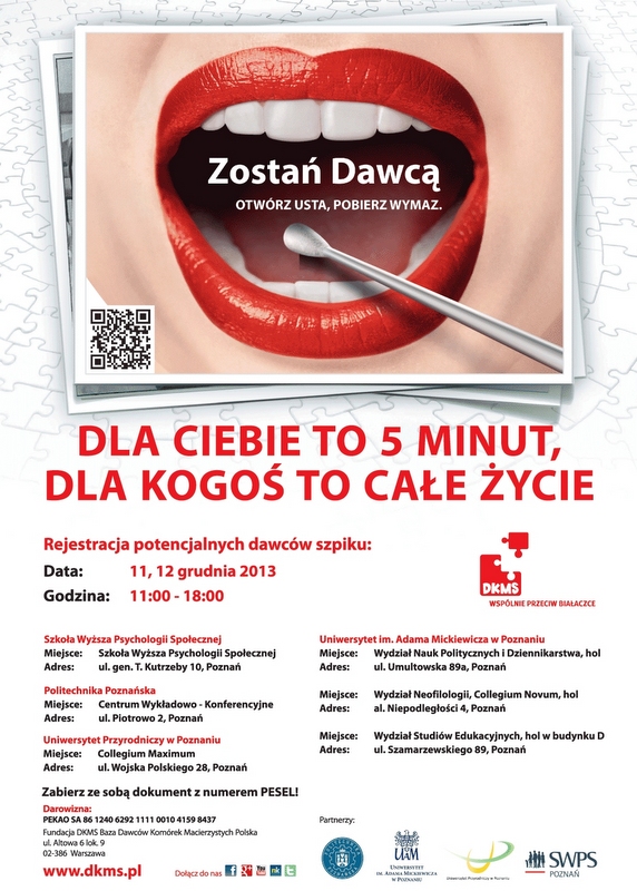 W środę akcja potrwa do godz. 18. W czwartek także można zapisać się do banku szpiku od godz. 11 do 18. Trzeba pamiętać, by zabrać dowód osobisty. Organizatorzy szacują, że przez dwa dni w Poznaniu powinno się zgłosić około tysiąca potencjalnych dawców. Przeszczep jest często ostatnią deską ratunku dla chorych na białaczkę.