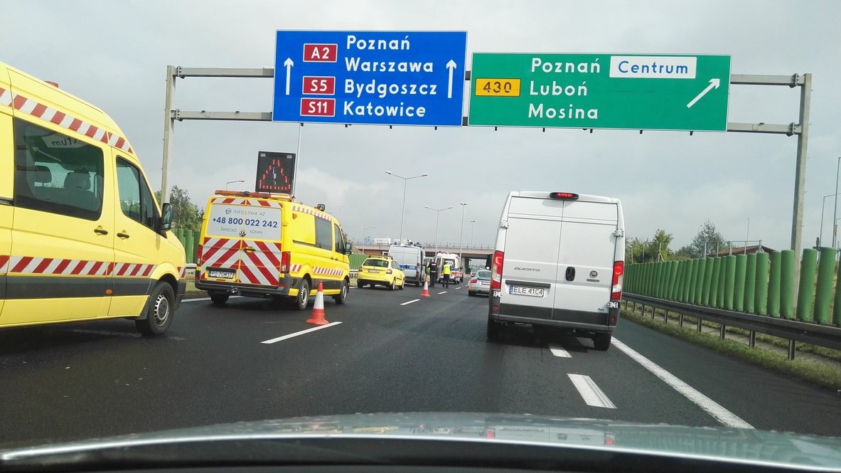 Na 163. km, czyli przed węzłem Poznań-Luboń, zderzyły się dwa samochody. W stronę Warszawy można jechać tylko jednym pasem. Korek zaczyna się już na węźle Poznań-Zachód. To nie jedyne utrudnienia na A2.