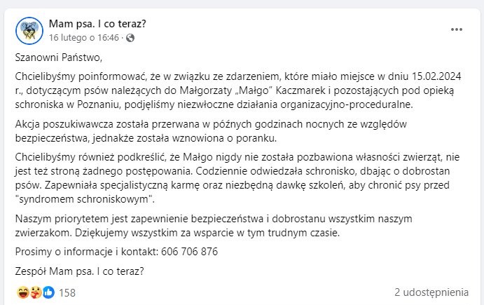 Według naszych informacji, to właśnie Małgorzata Kaczmarek wyprowadzała psy, które później rzekomo uciekły. Jak podkreślają przedstawiciele schroniska, służby pozwoliły kobiecie na odwiedzanie zwierząt.