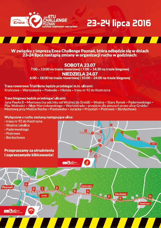 Triathlon to także bardzo duże utrudnienia w ruchu. W sobotę nie najgorzej jeździło się po Poznaniu, natomiast sparaliżowany był ruch na dawnej drodze krajowej 5 w okolicach Kobylnicy. Z powodu zamkniętej trasy nr 92 do Wrześni ogromne korki tworzyły się też w Swarzędzu.