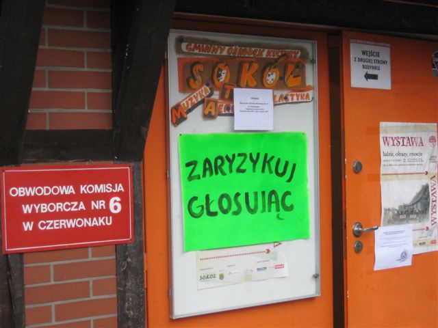 Mieszkańcy Czerwonaka głosowali już w lesie, na placu budowy czy na boisku piłkarskim. Tym razem w lokalu stanęły olbrzymie kostki do gry, mniejsze kostki zawieszono przy suficie. Kształt kostki do gry miała także urna. W tle słychać było uderzenia wyrzucanych kostek.