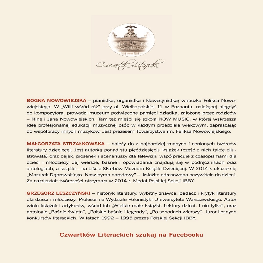 W wydarzeniu wezmą udział: Bogna Nowowiejska - pianistka, organistka, prezes Towarzystwa im. Feliksa Nowowiejskiego, Małgorzata Strzałkowska - pisarka, autorka książek dla dzieci, Grzegorz Leszczyński- historyk literatury, profesor UW.